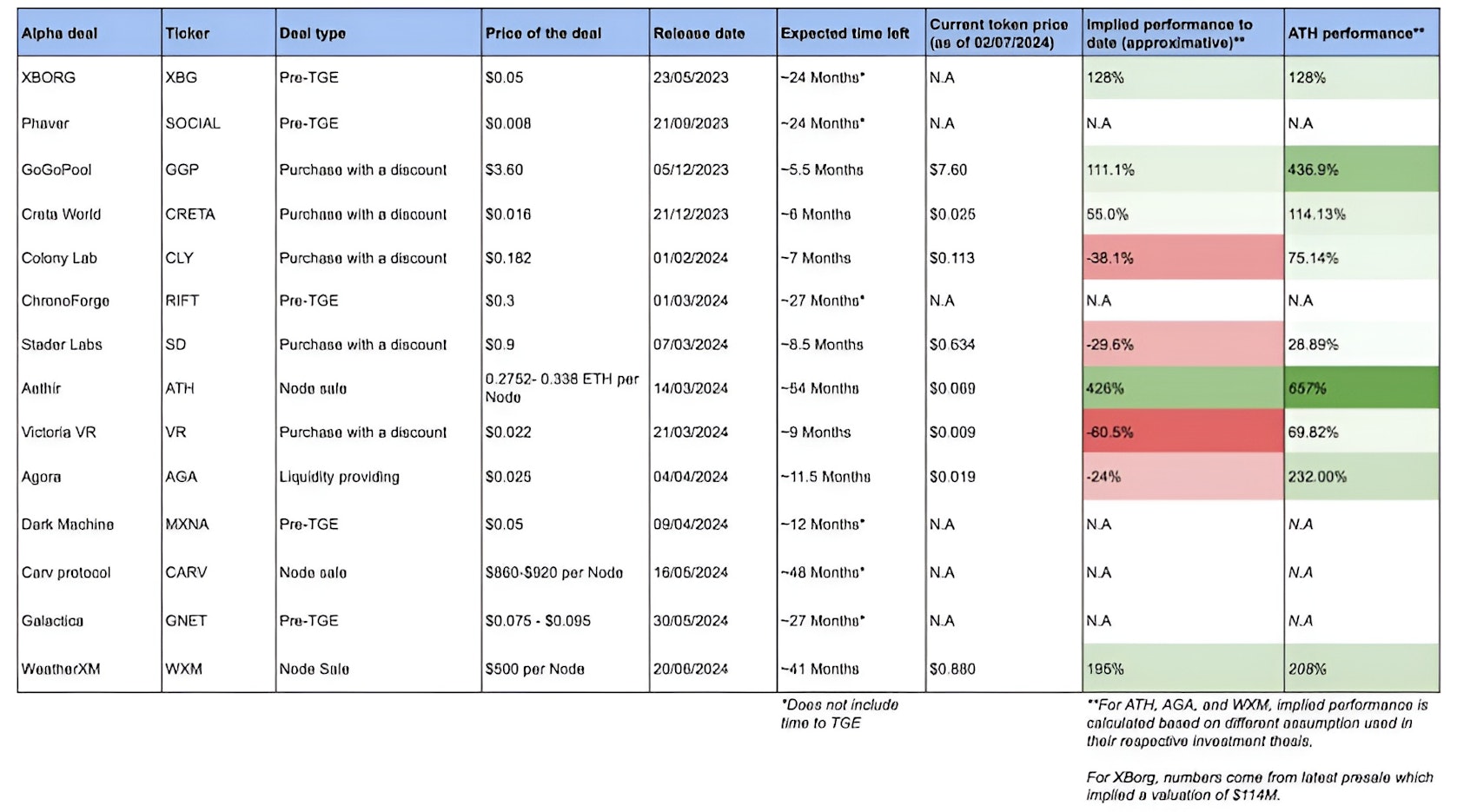It is important to understand that not all deals are liquid yet, as some have not had their Token Generation Event (TGE), and therefore we cannot compute their implied returns. Further, to calculate the implied returns of Aethir, Agora, and WeatherXM, we relied on different assumptions found in their respective investment theses. For XBorg, we used numbers from their last presale, which implied a valuation of $114 million.