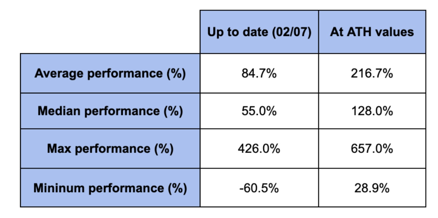 Based on this, we note that an equal-weighted portfolio in every alpha deal would yield a performance to date of approximately 85% and a median performance of 55%. On the other hand, using ATH (All-Time High) values, the average performance rises to 217% with a median of 128%.
