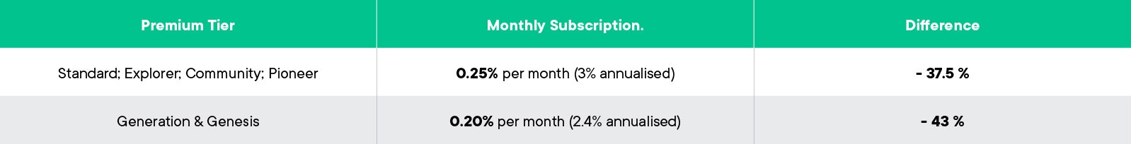 For our wonderful Community, Pioneer, Generation and Genesis users, we are dropping the minimum card top-up fee by 40%! As a reminder, these Premium tiers also receive some of the most competitive rates on the market for bigger top-ups via standard transactions, with 1.75% for Community and Pioneer, and 1.5% for Genesis and Generation.
