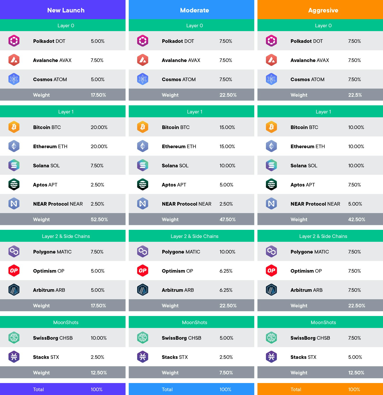 - Conversely, during sideways and bullish markets a same asset composition can lean towards a more moderate up to aggressive allocation respectively, putting more weight on smaller chains with greater volatility profiles (smaller mcap and volume) and thus upside potential.