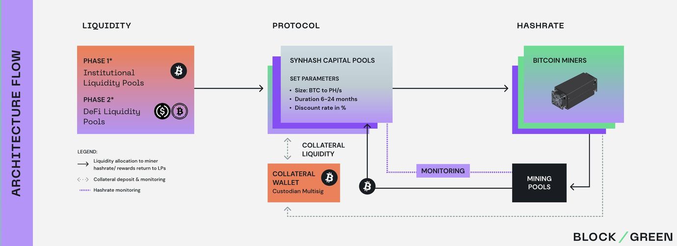 - The BTC holder (i.e. the liquidity provider) deploys the BTC assets to a so-called ‘SynHash’ pool. This is a dedicated pool with predetermined parameters for capital size, duration and discount rate.