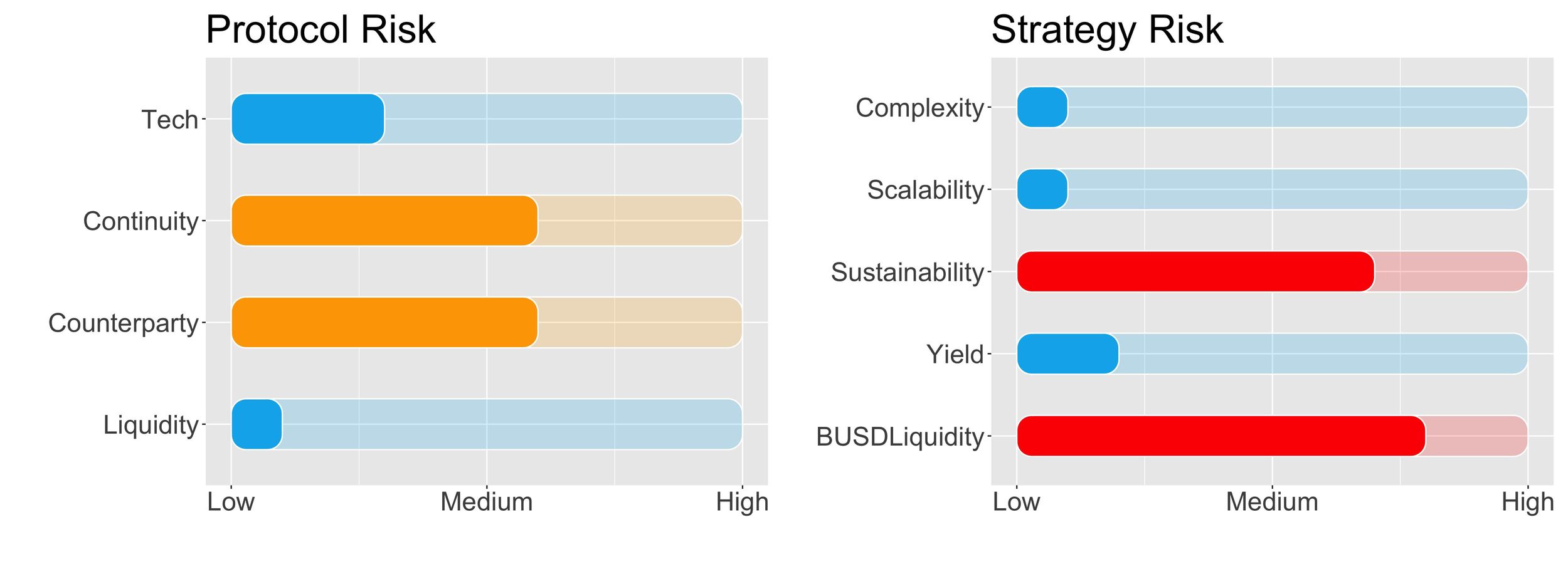 - While the strategy is fairly simple, it involves up to 1 chain (BNB), 1 stablecoin (BUSD), and two types of transactions: 1) a deposit into the pool, and 2) a transfer of the received Liquidity Provider (LP) tokens to the farming pool. Imbalances in the pools are caused by investors transferring tokens between chains may affect the ability for a user to redeem deposits (liquidity risk).