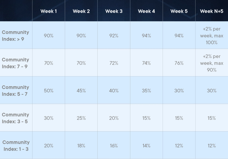 The percentage will be determined based on the Community Index level, and the number of consecutive weeks the Community Index has been in a certain range, with up to 100% of the fees being used to buy CHSB when the Community Index is higher than 9 for nine straight weeks!