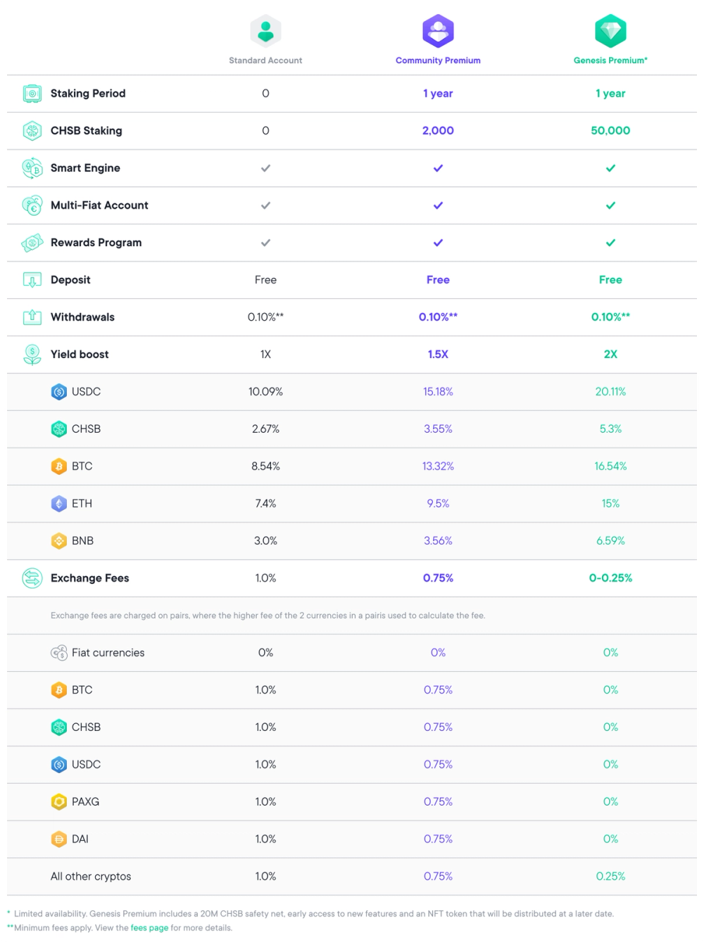 Genesis Premium is available for 50,000 CHSB and comes with the benefits of 0% fees on BTC, CHSB and stablecoin exchanges; 0.25% fees on all other exchanges; 2X the yield on CHSB, USDC, BTC, ETH and upcoming yield wallets; an exclusive NFT token (in development); and the 20M CHSB Genesis Safety Net.
