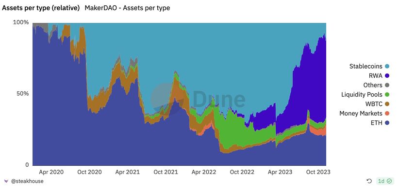 As we can see from the figure below, this new approach led to a significant increase in MakerDAO’s exposure to Real World Assets (RWA), as well as an increase in their stability fees. This move has allowed Maker to capitalise on being a first mover in the crypto industry's integration with real-world assets.
