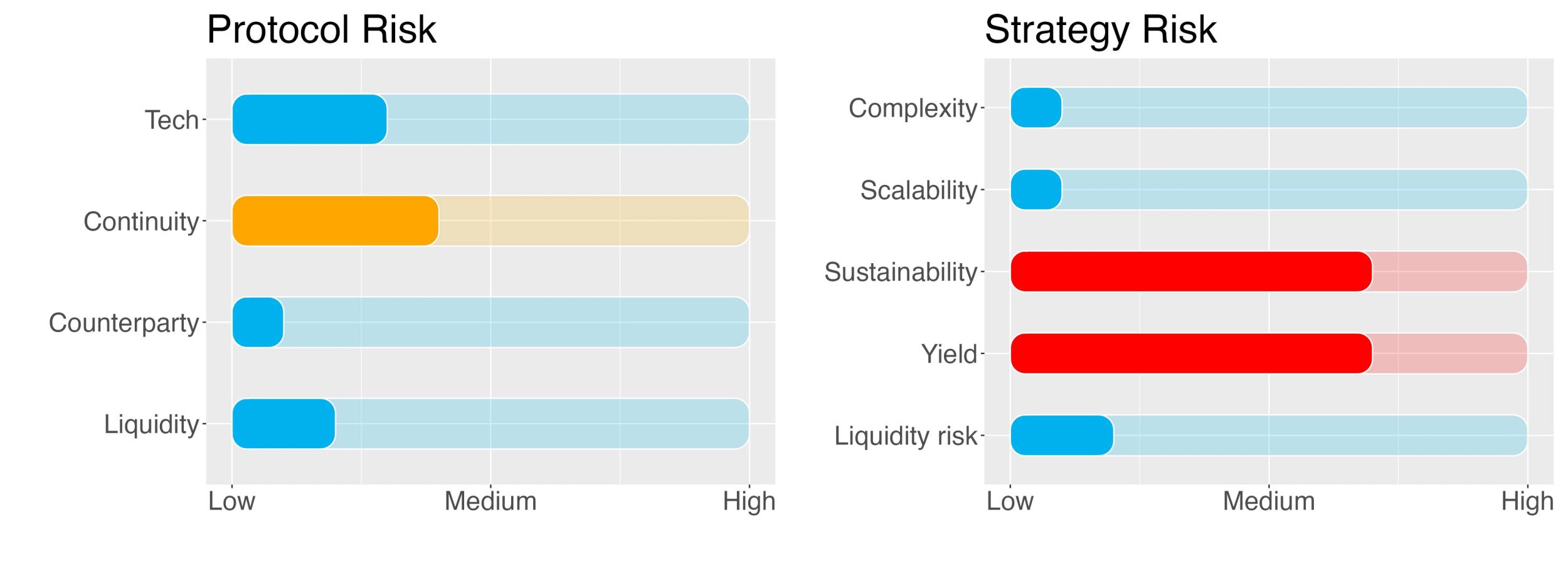 It is however a DeFi strategy, and even the most battle-tested protocols are not immune to exploits (see e.g. Curve reentrancy attack of Aug 4, 2023). In addition, it is not clear if and how incentives of MKR holders (DRS setters) and DAI holders (DRS beneficiaries) are aligned. This could affect the healthiness of the DSR approach (sustainability risk) and the offered APY (yield risk).