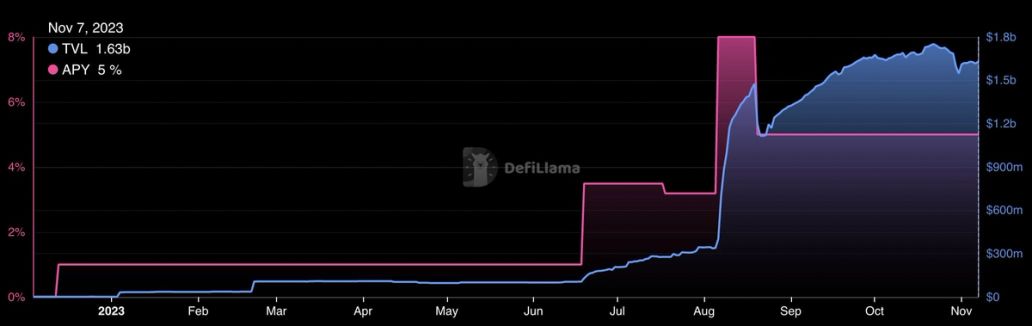The figure below shows the most recent evolution of the DSR. Before Dec 2023 it was at 0.01%. It then increased to 1%, 3.5%, 8% and it’s now at 5%. The volatility of the APY is non negligible.