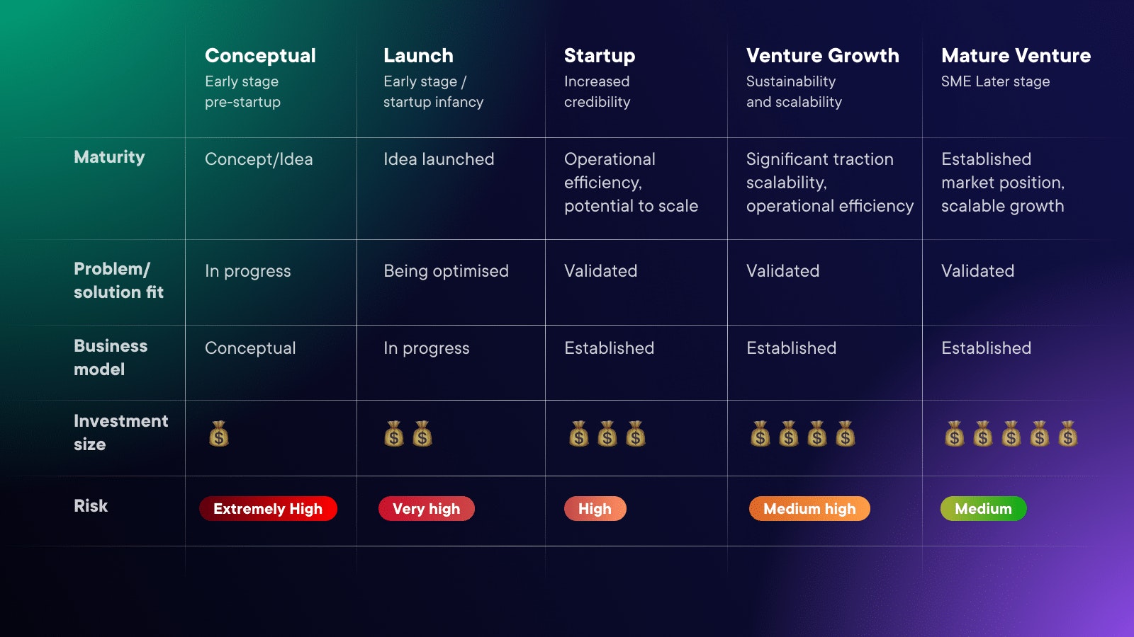 The table below shows during the various stages of a project’s growth its level of maturity (also in terms of business model and investment size) and the inherent risks of investing at each stage.