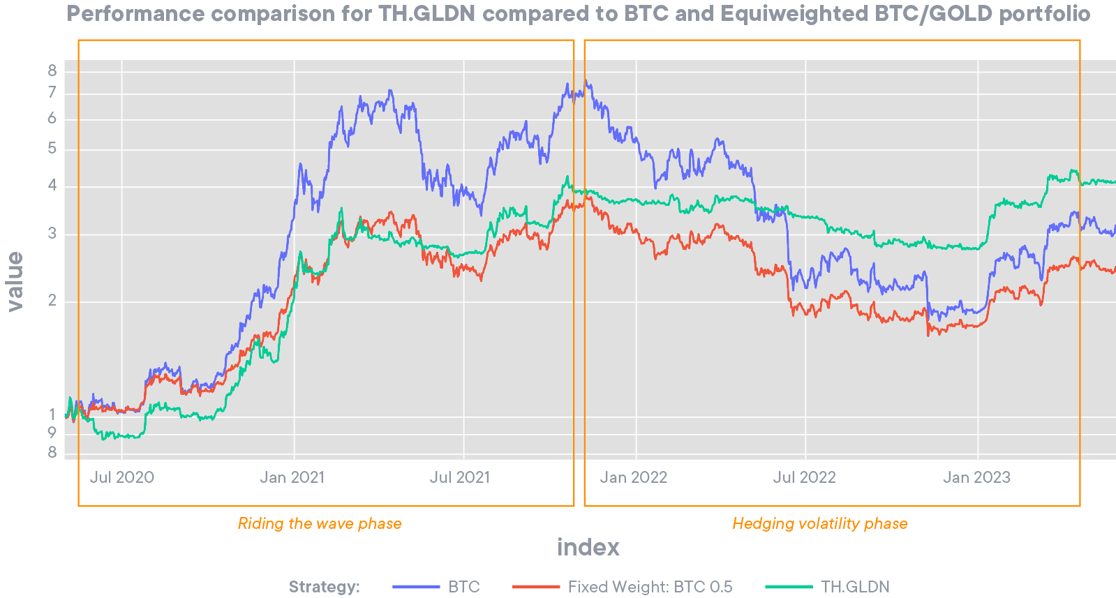 This backetest showcases the dynamic capacity of the Golden Crypto Bundle to adapt to different market regimes. During bullish Bitcoin price movements the Golden Crypto Bundle is able to “ride the wave” and present a strong correlation to Bitcoin. As the market turns and shifts downwards the Golden Crypto Bundle breaks that corollary, significantly over performing Bitcoin with hedging itself in Gold to minimise drawdowns.