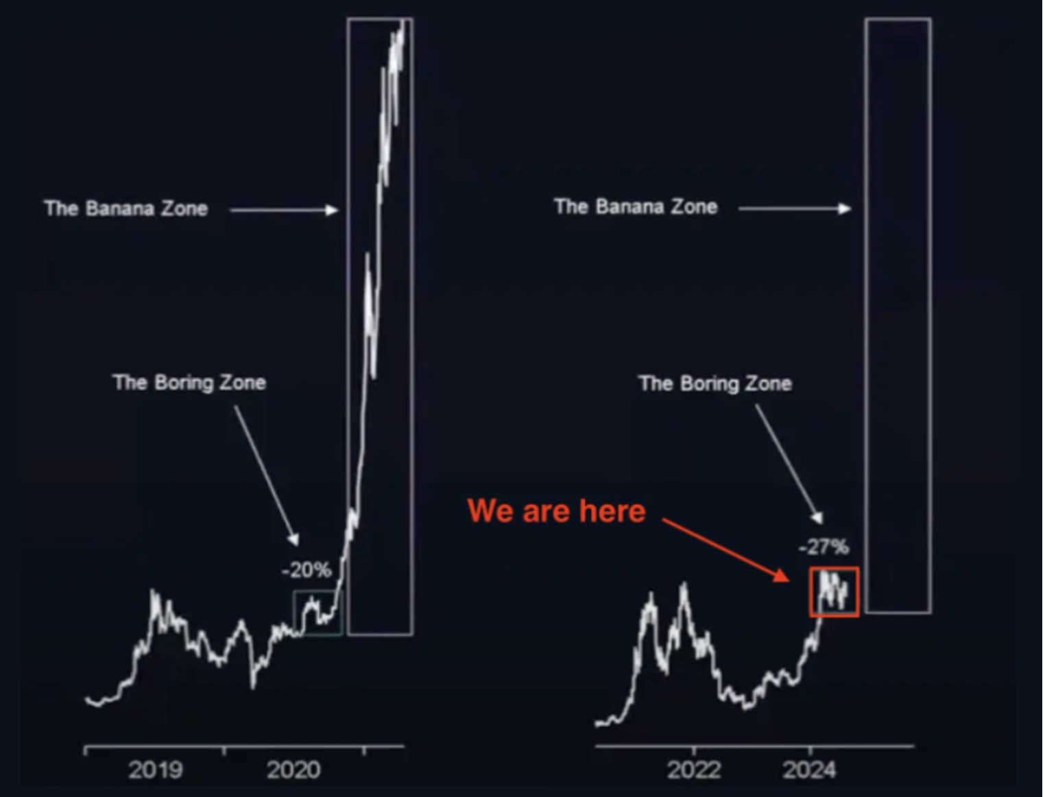 - The Banana zone: in August I heard many people talk about the banana zoneβ¦what is it exactly? The "Banana Zone" usually kicks in when the business cycle reaches its peak. The expansion phase of the business cycle is fueled by fresh liquidity flowing into the economy. This influx is driven by several factors, including, but not limited to, lower interest rates that encourage borrowing and spending. And as we just mentioned, the stars (or rather, the central bankers) seem to be aligning for a Fed rate cut in September. So, while the markets might be having a rough patch in the short term, the conditions necessary to usher in the Banana Zone are quietly coming together.