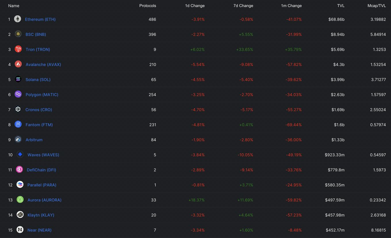 Since Terra vanished from the DeFi space, the sphere has seen some significant TVL dominance repositioning. In the last month, Tron has been the only blockchain to grow in TVL. In fact, it is the only blockchain in the top 20 by TVL that has grown in TVL since the start of 2022, with other networks falling anywhere between 30% and 70%