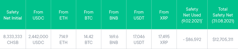 SwissBorg established a USD1 million Safety Net Program in CHSB (8,333,333 CHSB) to protect against Smart Contract risk, and we have historically put the equivalent of 25% of max yield earnings into that program to ensure it grew alongside our community’s investments.
