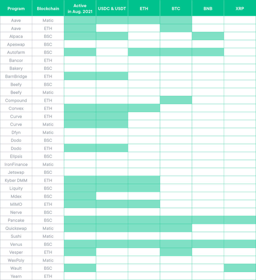 Safety remains a concern in DeFi, with the largest exploit in DeFi history taking place in August. We had previously identified cross-chain platforms as an emerging trend, and due to the novelty of this type of platform, there is an increased security risk. PolyNetwork is one such cross-chain platform and suffered a loss of $600+ million but was returned by the ‘white-hat’ hacker soon after, though the non-malicious intention of the exploiter was not initially apparent. Several other exploits also took place in August, with two of them netting upwards of $18 million. It is easy to see that the longer a user participates in DeFi platforms outside of the very large household names, the more likely it is they will incur a loss due to exploits.