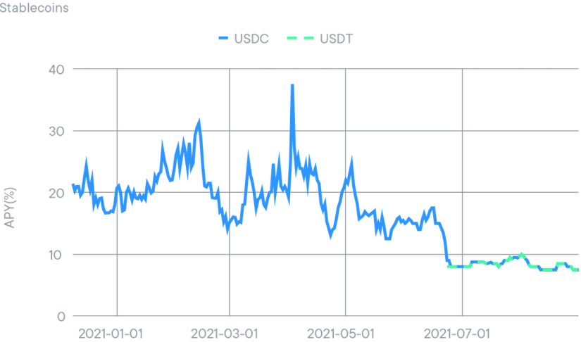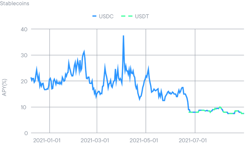 The most used yield wallets (USDC, ETH and BTC) have seen their yields decreasing over the last two months. (The yield offered on CHSB, which is not part of the Smart Yield program, has become the most attractive and least volatile of the yield-earning crypto assets available in the SwissBorg app). Despite very similar yields for USDC and USDT, the interest for USDC continues to attract more contributions.