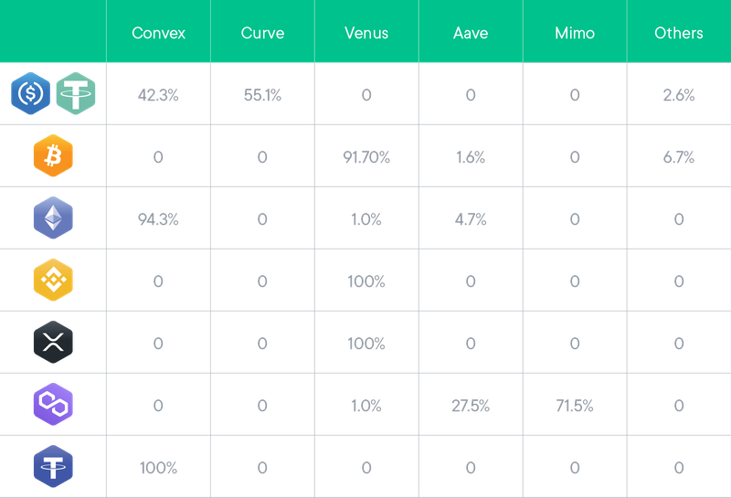The allocation is very similar to the one in December, with Convex and Curve representing almost all the allocation of stablecoins. BTC saw a slight change of allocation with a new strategy coming on Aave.