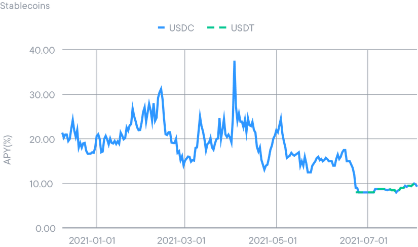 Drawing conclusions by looking at the above in isolation is difficult, and the reasons can be bullish or bearish. The bearish case states that people already holding ETH have capitalised on returns from yielding, and as prices rise across the market, assets are withdrawn from DeFi yield platforms to sell at a profit. The difference in the bullish case is in the reasoning for selling. A more positive outlook in the market tends to increase risk-taking behaviour, where assets (ETH, BTC and stablecoins, all of which form the majority of deposits on DeFi platforms) are exchanged for smaller and riskier tokens. With the London upgrade to Ethereum in early August and continued rising prices in the large-cap crypto assets, it is likely the bullish case.