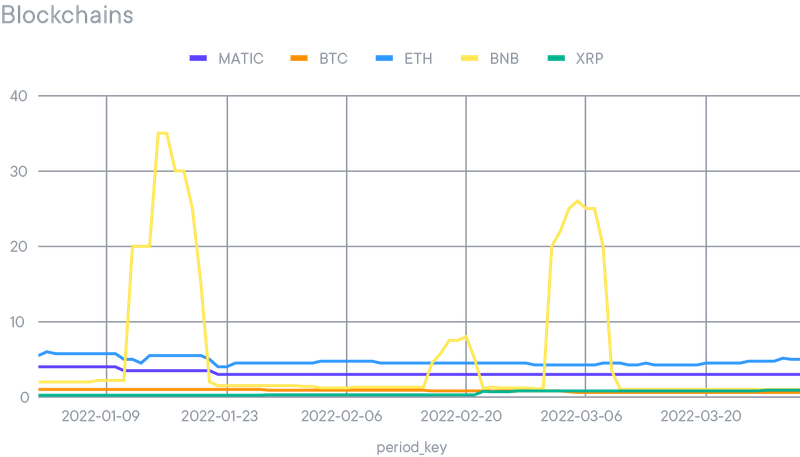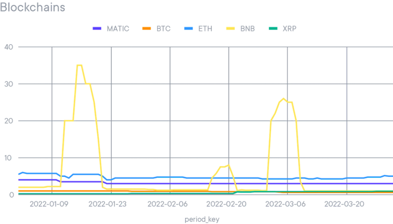 On the security front, one of the largest exploits occurred in March. More than $600 million in Ether was stolen from the Ronin Bridge (a side-chain for Axie Infinity). The hack is unlike those we have seen previously as it was not due to smart contract bugs, but more ‘traditional’ in nature: some of the private keys of the Ronin bridge validators were stolen which allowed unlocking of the assets. It’s also worth remembering that the top 3 highest grossing exploits have all been on cross-chain infrastructure projects (Ronin, PolyNetwork, Wormhole), and this is in addition to the highest bug bounty paid for an exploit found (and patched) on the Polygon Bridge. These events underline the importance of decentralization when it comes to bridges, and how most current solutions are making several compromises on security.