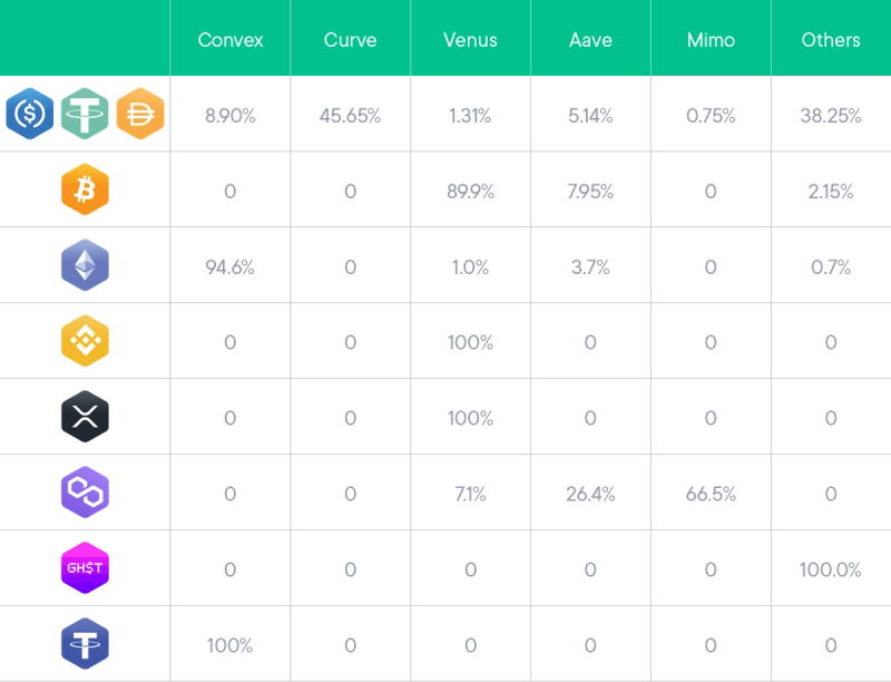 DAI has been added to the list of stable coins and provides the same yield as other USD stable coins. The rest of the tokens have kept a similar exposure to the protocols. Beefy protocol remains an important part of the Stable coin Yield wallet, keeping a competitive and safe APY. The GotchiVault has been added and provides yield for GHST. The vault allows veteran Gotchi community members to optimize the GHST yield for all depositors by participating into ingame events.