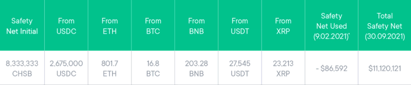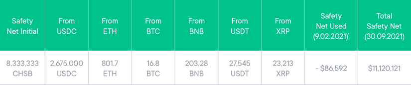 SwissBorg established a USD 1 million Safety Net Program in CHSB (8,333,333 CHSB) to protect against Smart Contract risk, and we have historically put the equivalent of 25% of max yield earnings into that program to ensure it grew alongside our community’s investments.