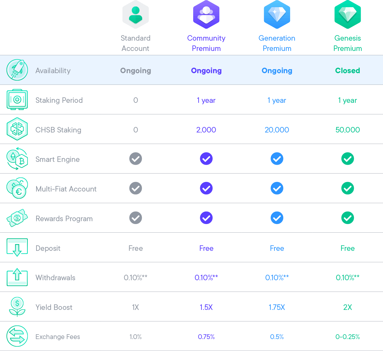Smaller token holders get to boost their wealth and thus become part of Community Premium, giving them a 1.5X yield multiplier on their wealth and reducing the circulating supply of CHSB.