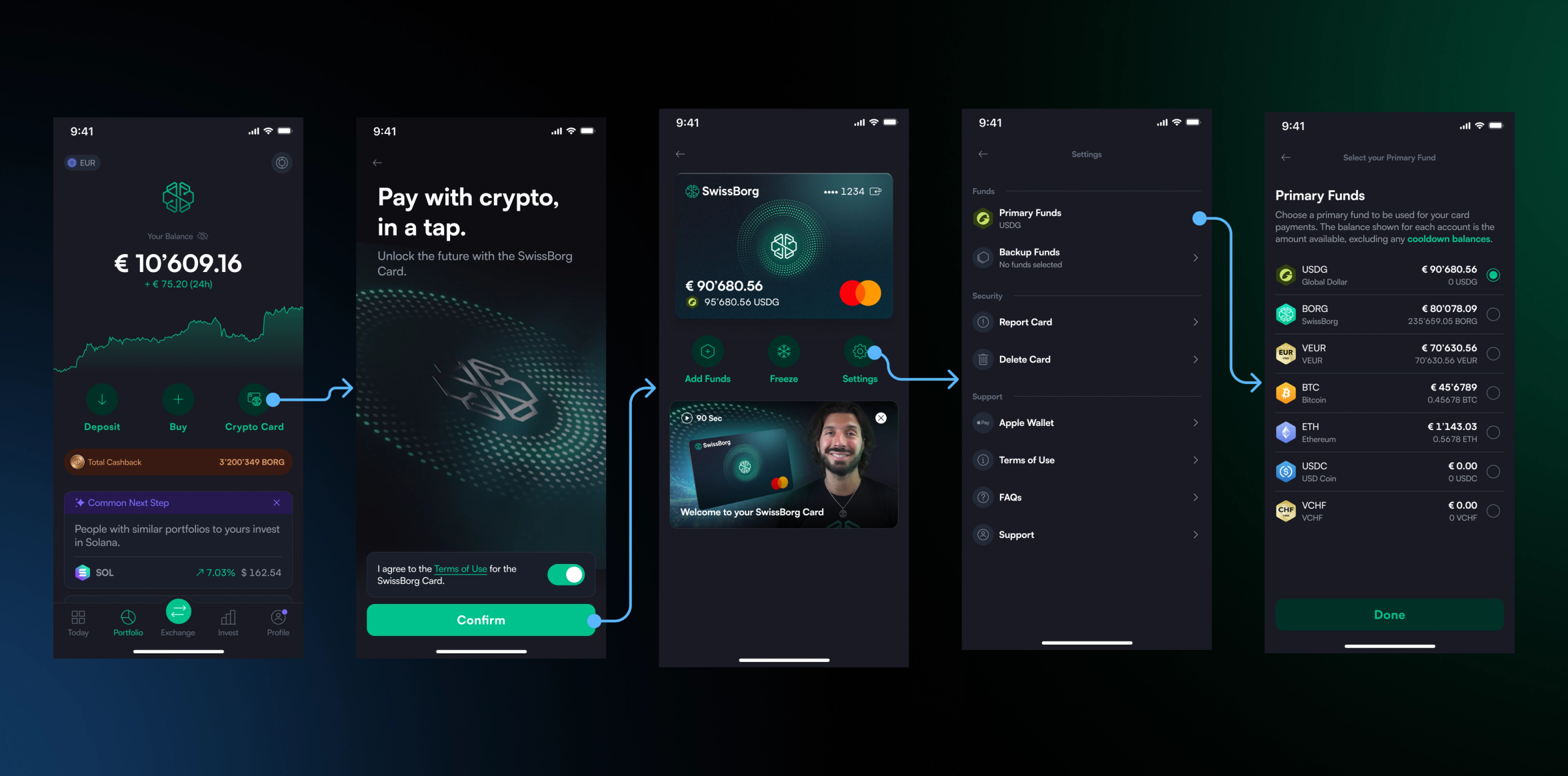 - No Pre-loading Required: Keep your assets in your portfolio until the very moment you spend. The SwissBorg Meta-Exchange swaps the exact amount needed at the time of purchase.