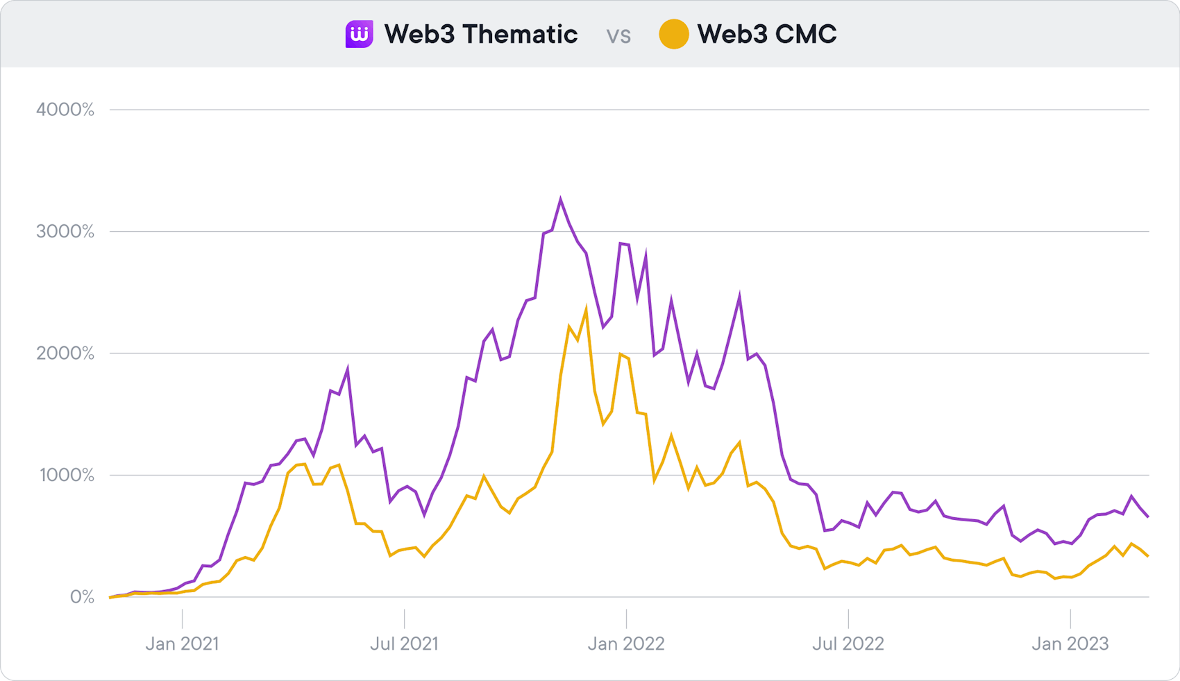 Our first Web3 Crypto Bundle has been proving its competency by continuously outperforming its CMC index counterpart - with its automated Rebalancing continually buying low/selling high and its reallocation mechanism keeping it at the forefront of industry shifts.