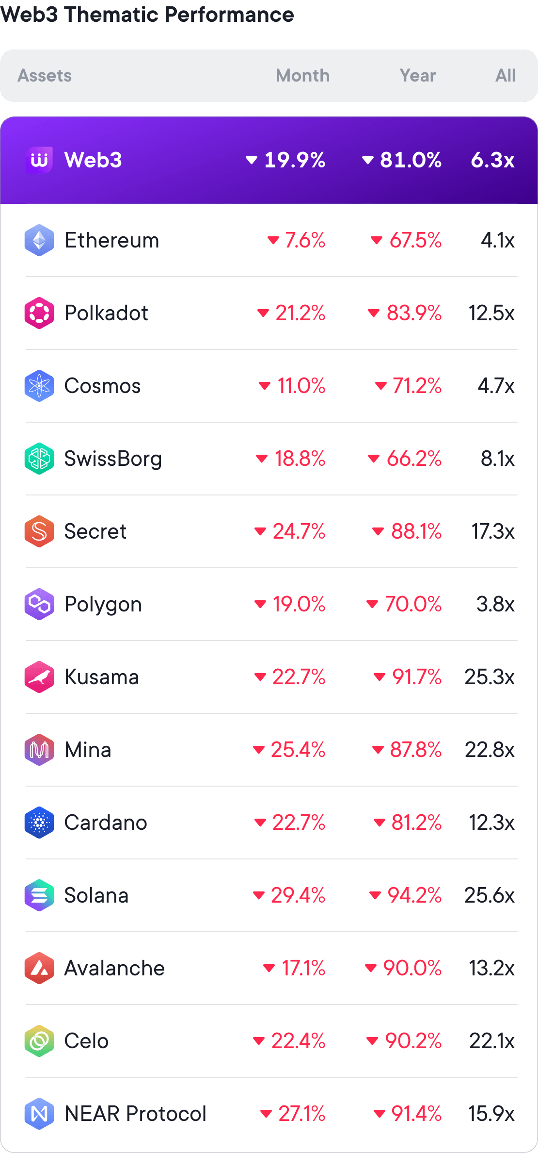First and foremost, the performance of the Web3 Crypto Bundle is compared to all the individual tokens that make up this bundle. As a clear advantage of diversification through Crypto Bundles, although a few tokens will outperform the Web3 Crypto Bundle, selecting those tokens can be tricky.