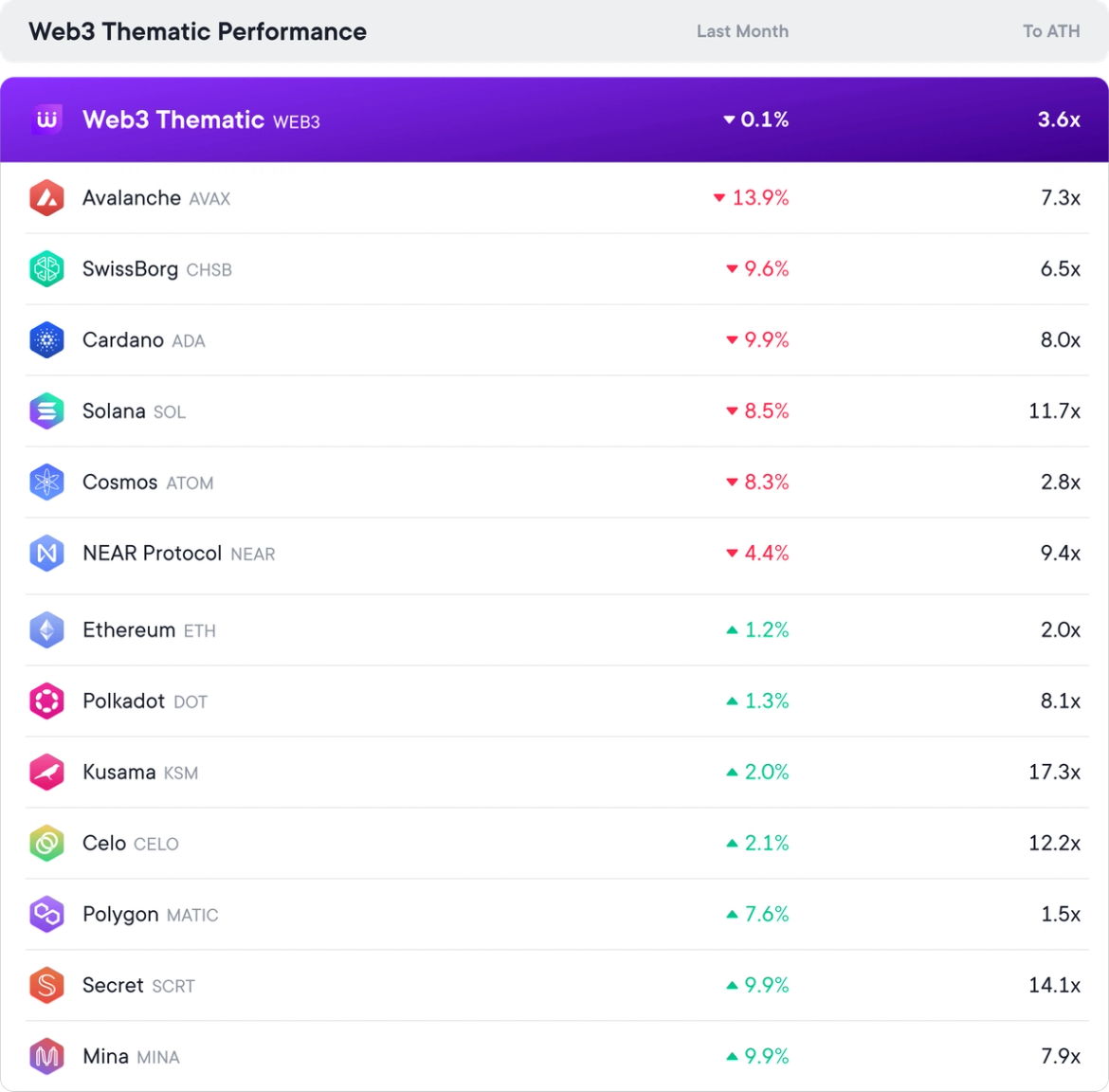 The Web3 Thematic is positioned somewhere in the middle, which is its exact purpose. The goal of Web3 Thematic is to overperform in holding the safest assets while mitigating the downside of holding risky assets.