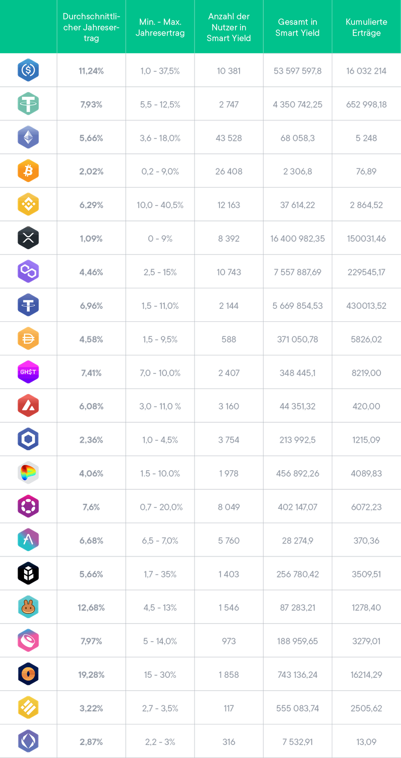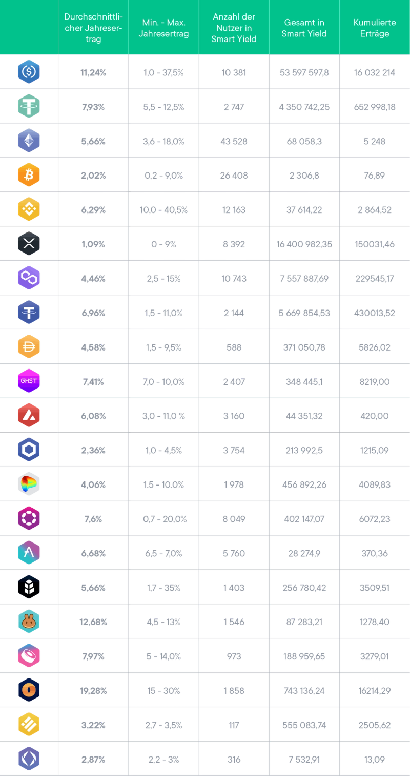Die Smart Yield-Wallet vereinfacht und optimiert jeden Tag den Ertrag deiner Krypto-Assets. Ziel ist es, den höchsten Ertrag bei geringstem Risiko zu erzielen sowie einige der besten Ertragsbedingungen zu bieten, die auf dem Markt erhältlich sind.