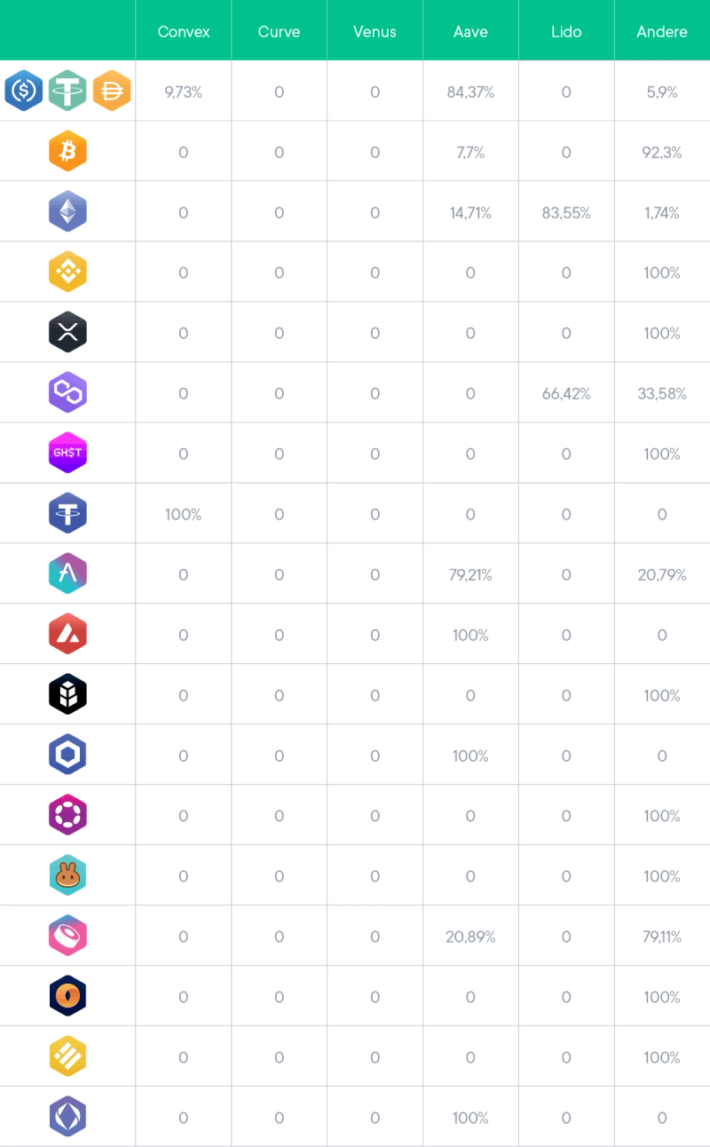 Das Alpaca-Protokoll wurde weiterhin für die BNB und BUSD Yield Wallets verwendet und bietet einen sicheren und wettbewerbsfähigen APY. Matic-Erträge kommen jetzt aus dem liquiden Staking auf Lido sowie aus einigen nativen Staking, der sichersten Ertragsquelle. Auch bei DOT gab es einige Änderungen und es wird nun gestaked, um Erträge zu generieren.