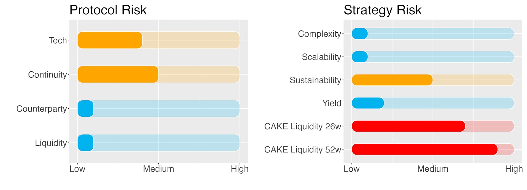 - La stratégie est hautement scalable et le yield pourrait afficher une faible volatilité. L’APY offert n'est cependant pas "réel" et repose en partie sur le fait que les tokens CAKE n'ont pas d'offre limitée. Cela crée un compromis entre le yield offert et la pression déflationniste sur le prix du token (risque de durabilité).