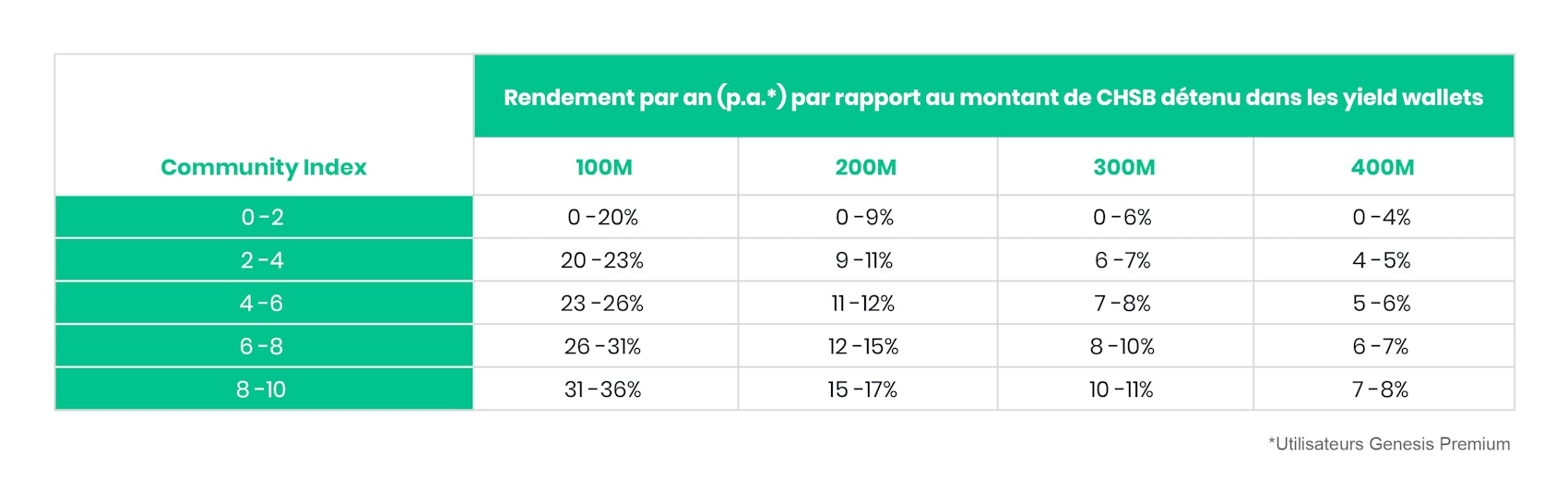 Le rendement sur le CHSB sera calculé en fonction du score hebdomadaire du Community Index, avec différents niveaux en fonction de la quantité de CHSB que la communauté détient dans les Yield wallets.