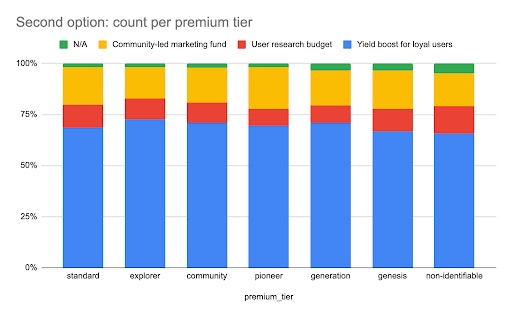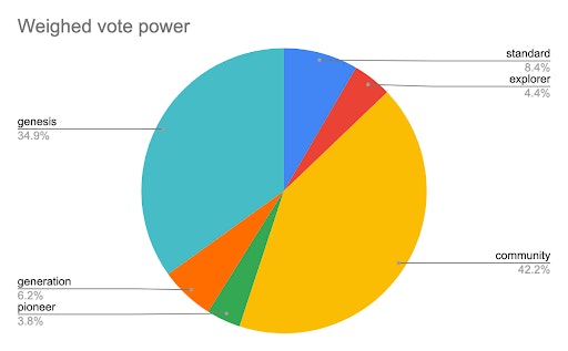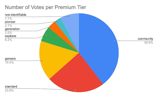 Si l'on prend en compte le poids des votes, les utilisateurs Premium de Community et Genesis ont été les plus influents, donnant 42,2 % et 34,9 % du total des votes pondérés. Cela n'est pas surprenant, car il s'agit des niveaux premium les plus anciens.