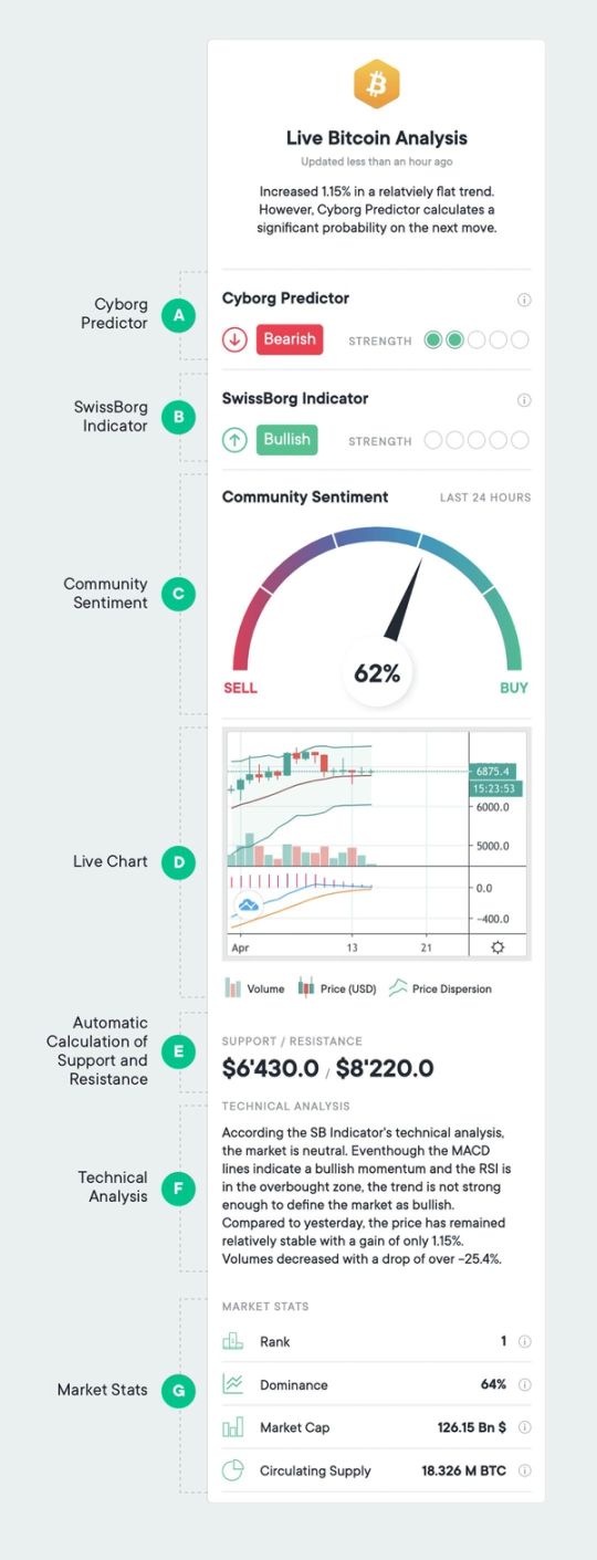 Nous avons développé une analyse intelligente automatique qui est mise à jour toutes les heures pour tous les tokens disponibles dans l'application SwissBorg. Notre analyse automatique utilise l'intelligence artificielle (IA) pour vous aider, de manière systématique, à prévoir les mouvements du Bitcoin et d'autres cryptomonnaies.