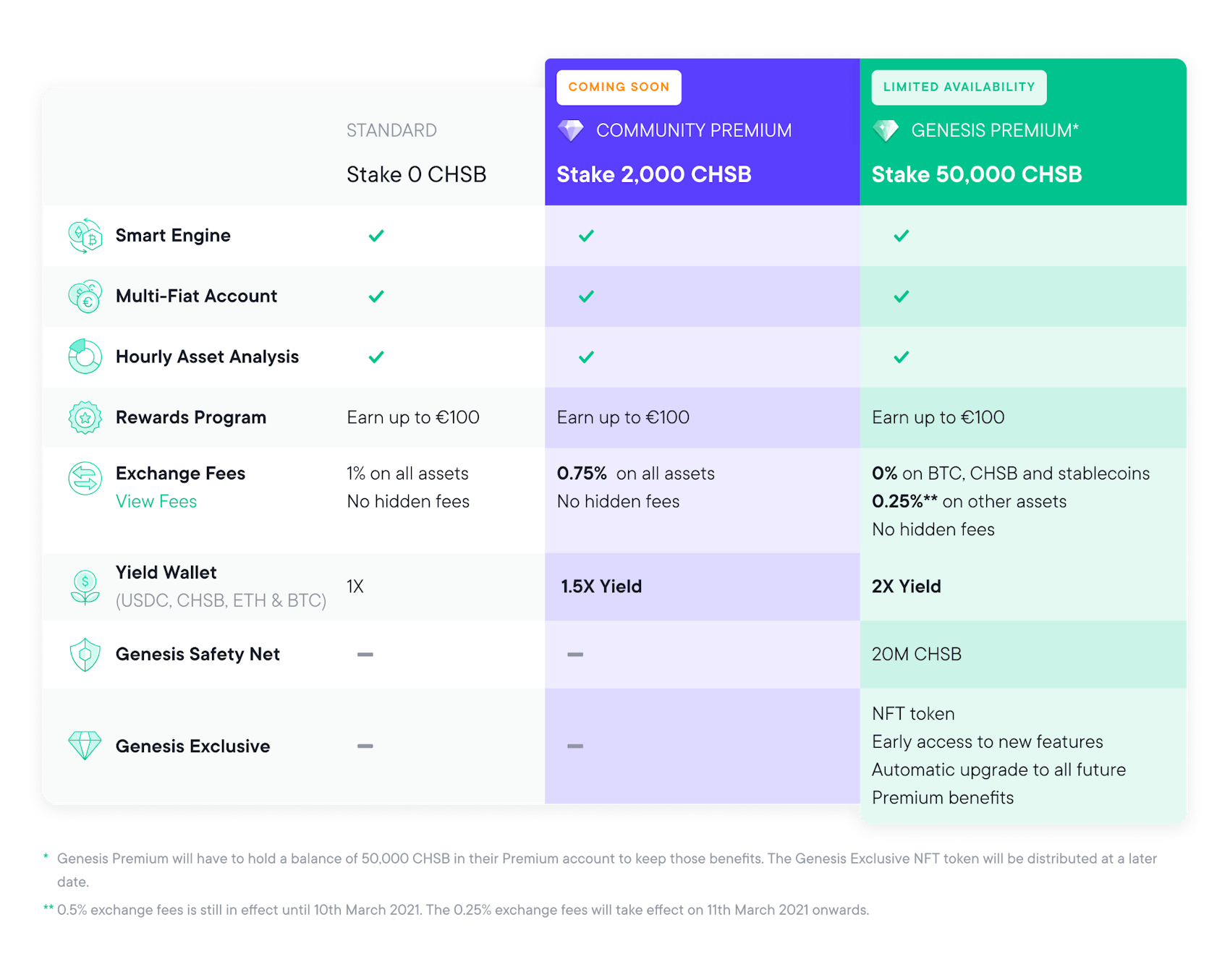 Le compte Genesis Premium est notre façon de remercier ceux qui nous ont soutenus en stakant leurs CHSB dès les premiers jours de notre application. Pour cette raison, tous les utilisateurs Premium existants seront automatiquement mis à niveau vers Genesis Premium et bénéficieront de frais moins élevés à partir du 11 mars 2021 !