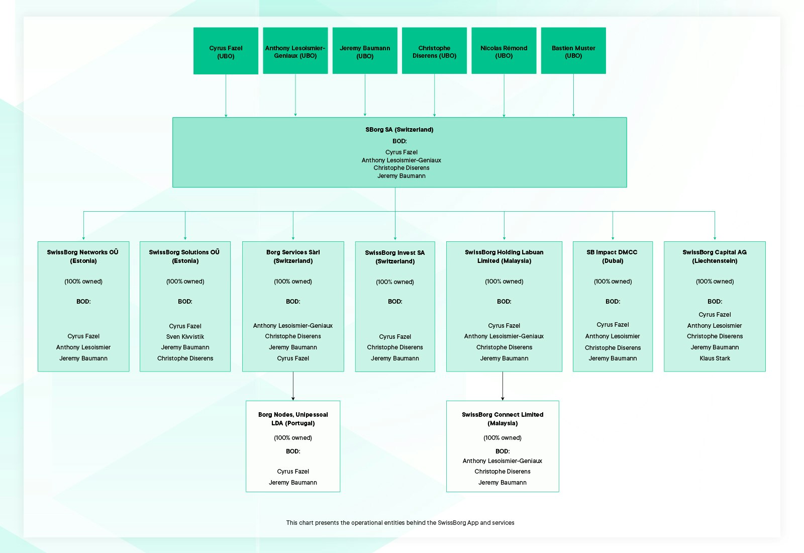Chez SwissBorg, 8 personnes font partie de l'équipe de direction, et 6 d'entre elles sont actionnaires, dont 5 vivent en Suisse et 1 aux EAU, comme le montre la figure 2.0.