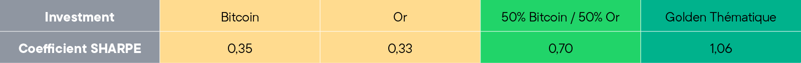 La Thématique Golden combine le plein potentiel du Bitcoin avec la valeur intemporelle de l'Or pour créer un socle inébranlable pour vos objectifs financiers. Il est temps de traiter votre argent durement gagné comme il faut. Placez-le dans des actifs de réserve de valeur qui sont en capacité d'augmenter votre pouvoir d’achat. Les plus éminents étant le Bitcoin et l’Or. Avec la Golden Thématique voyez votre investissement s'optimiser automatiquement au fil de l'évolution du marché