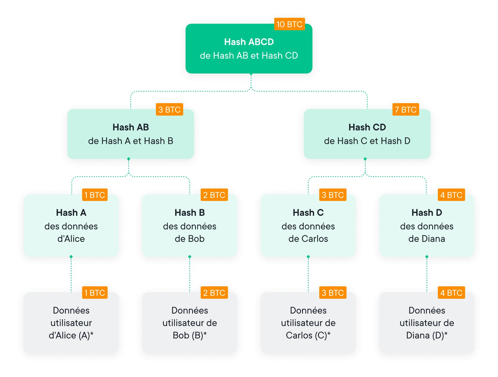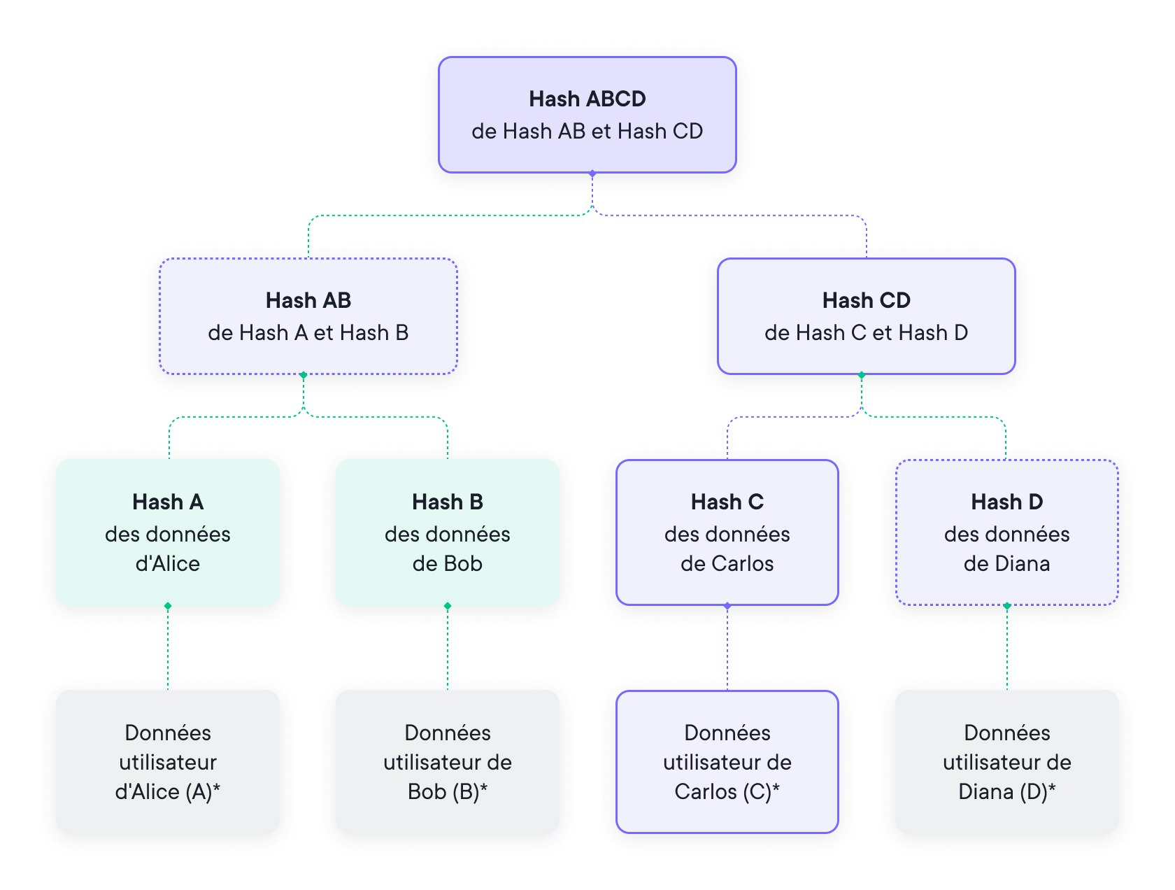 - Données feuilles : nonce feuille, userID, sous-solde