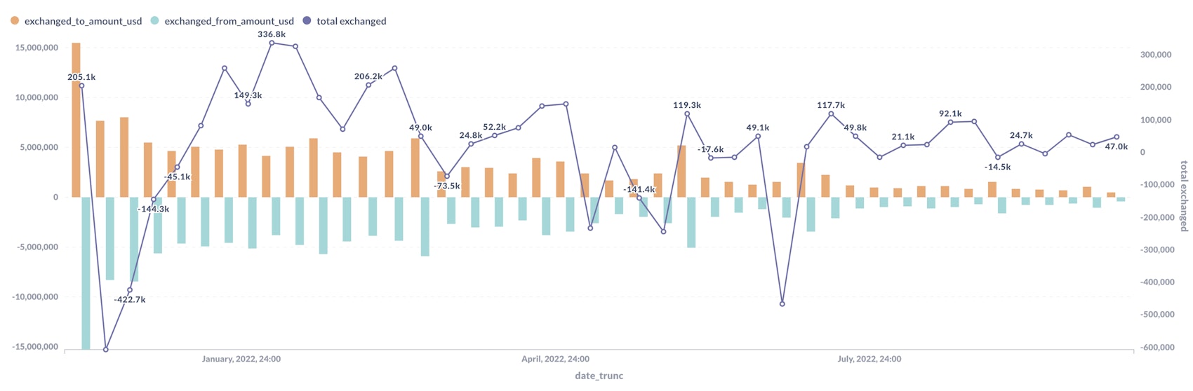 Avec les conditions macro du marché actuelles, telles que la sous-performance du Bitcoin par rapport aux actifs classiques, l'inflation et le manque d'intérêt général pour les cryptoactifs, la stratégie de stabilisation du prix vis-à-vis du Bitcoin avec un ordre limite a été conservée. En raison de la détection d'une faible demande sur le marché et dans l'application (voir ci-dessous), aucun ordre de marché n'a été utilisé. En raison de l'incertitude macroéconomique du marché, de la structure du carnet d'ordres et de la forte corrélation avec le Nasdaq, nous avons adopté une stratégie visant à nous assurer que nous ne tombons pas en dessous du niveau critique par rapport au Bitcoin.