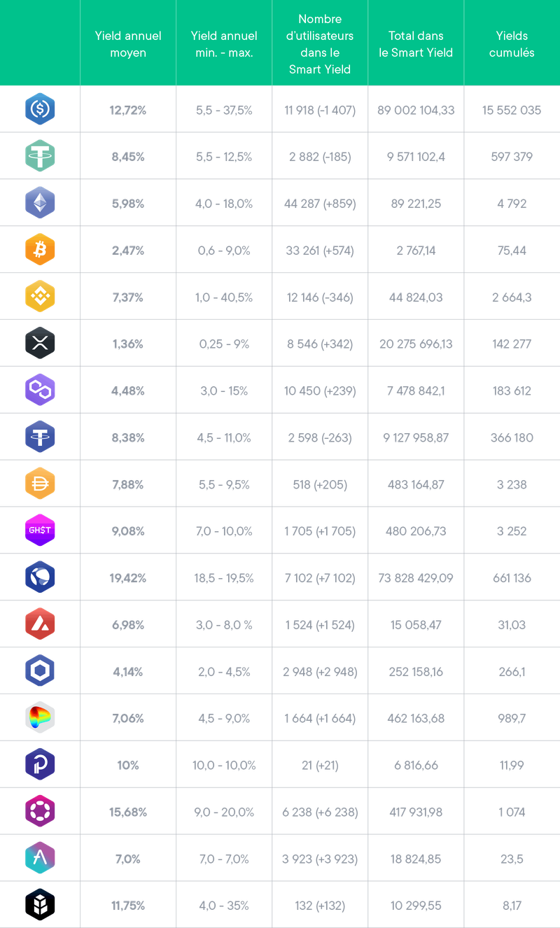 Dans un souci de transparence envers notre communauté, nous recueillons mensuellement nos données pour vous donner un rapport sur les chiffres clés liés aux portefeuilles Smart Yield de SwissBorg.