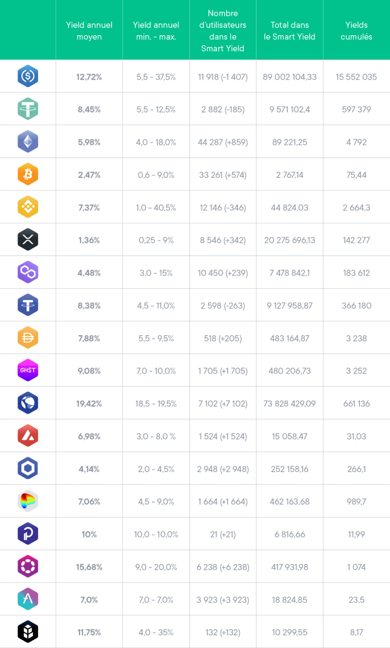 Le Smart Yield wallet simplifie et optimise chaque jour le rendement de vos cryptoactifs. L'objectif est de trouver le meilleur rendement pour le risque le plus faible, ainsi que d'offrir certaines des meilleures conditions de rendement disponibles sur le marché. Découvrez comment fonctionne le Smart Yield.