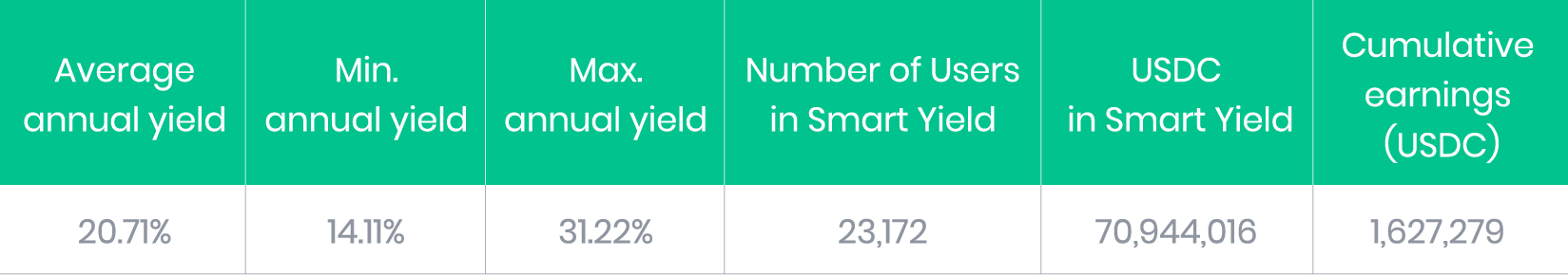 Le rendement pour l'USDC continue de se situer en moyenne à plus de 20% par an pour les utilisateurs Premium. Au cours des trois derniers mois et demi, les utilisateurs ont gagné plus de 1,6 million USDC grâce à leurs Smart Yield wallets.