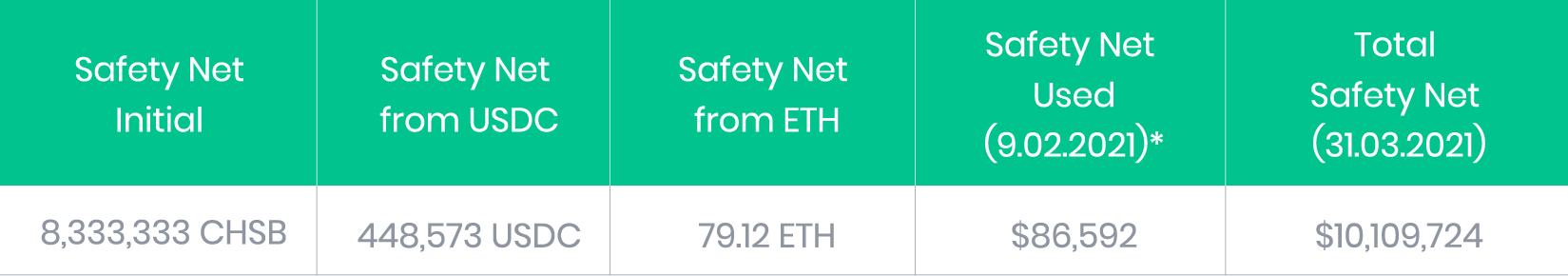SwissBorg a également mis en place un programme de filet de sécurité de 1 million USD en CHSB (8 333 333 CHSB) pour se protéger contre le risque de smart contract, et nous investissons l'équivalent de 25% des revenus du rendement maximum dans ce programme pour nous assurer qu'il se développe parallèlement aux investissements de notre communauté.