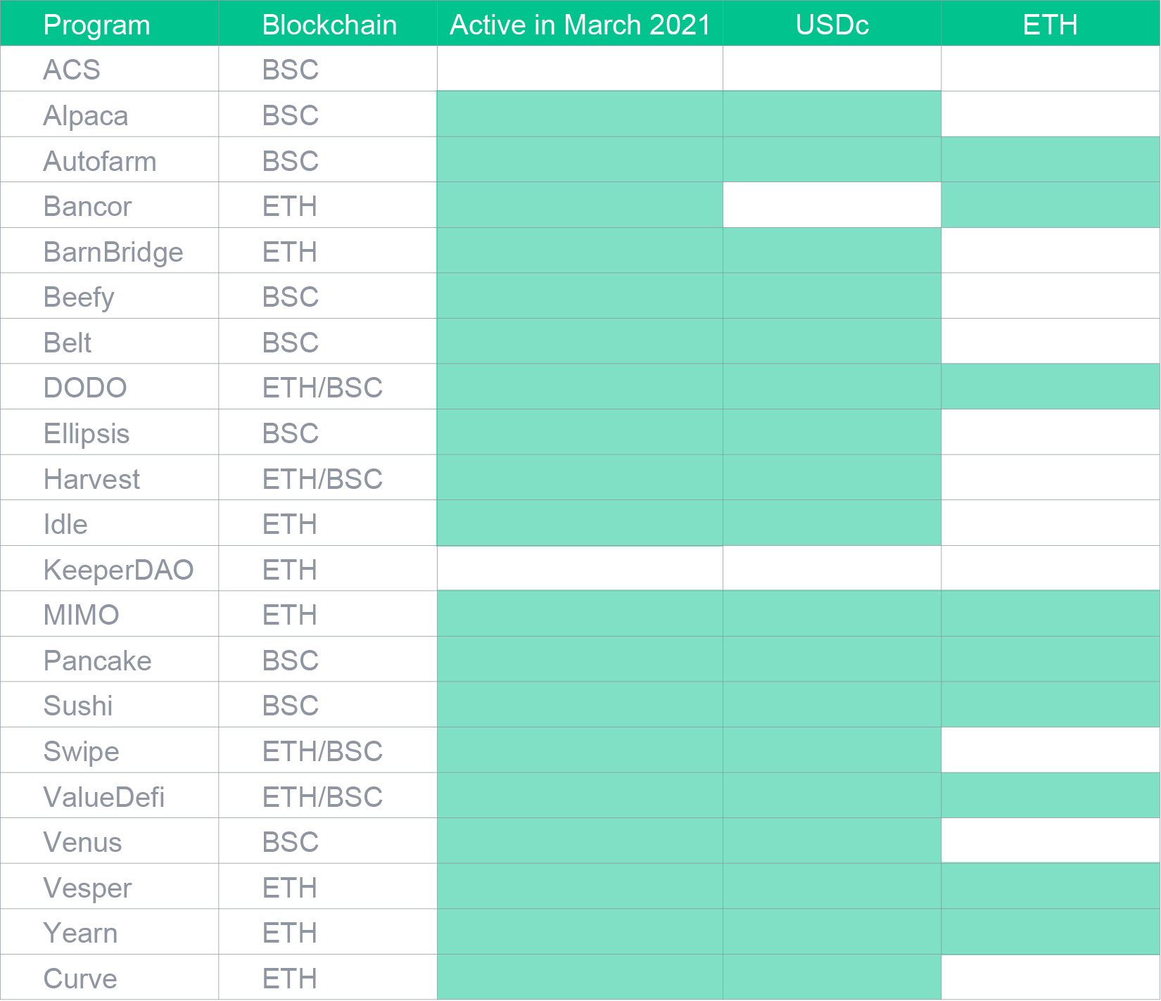 Selon Defi Pulse, la TVL totale d'Ethereum DeFi a augmenté de 20% en mars, atteignant plus de 50 milliards de dollars, tandis que la TVL totale de Binance Smart Chain a atteint 24 milliards de dollars. La liquidité est toujours disponible sur les plateformes qui promettent les rendements les plus importants, ce qui a été montré par Belt perdant une partie substantielle de TVL lors de la sortie d'Ellipses.