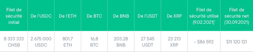 SwissBorg a mis en place un programme de filet de sécurité d’1 million USD en CHSB (8 333 333 CHSB) pour se protéger contre le risque de smart contract, et nous avons toujours investi l'équivalent de 25% des revenus du rendement maximum dans ce programme, pour nous assurer qu'il se développe parallèlement aux investissements de notre communauté.