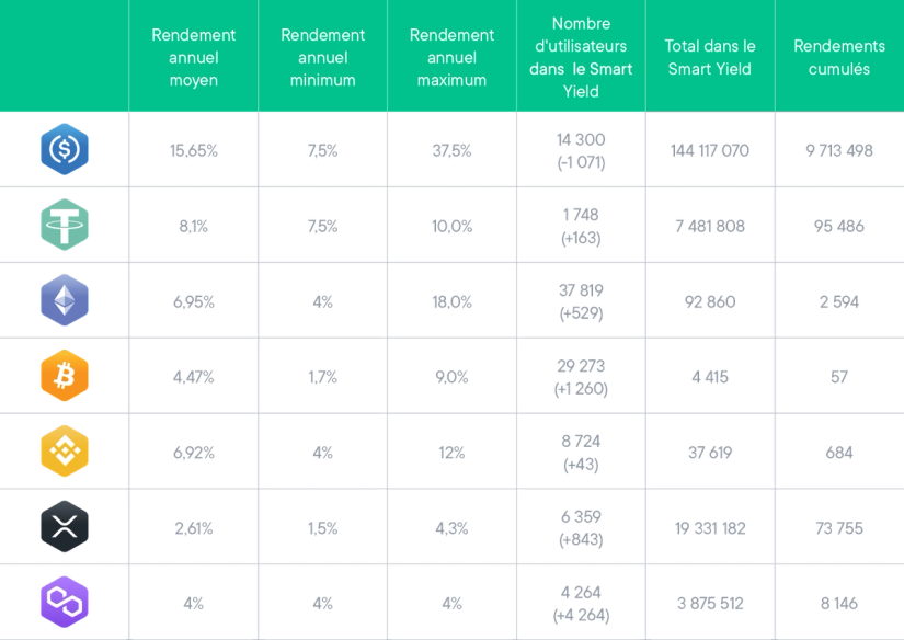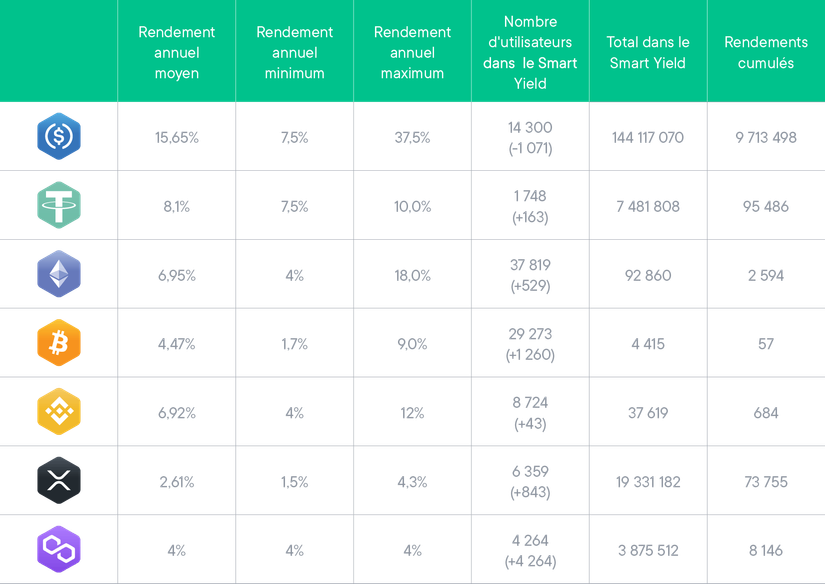 Ce mois-ci, un nouveau cryptoactif a été ajouté au programme Smart Yield: MATIC, le token natif de Polygon, une blockchain compatible avec Ethereum qui est devenue très populaire au début de l'année pour son alternative bon marché aux plateformes DeFi. De nombreux utilisateurs ont activé le Smart Yield wallet, plus de 4 000 utilisateurs obtenant un rendement sur leurs MATIC à la fin du mois.