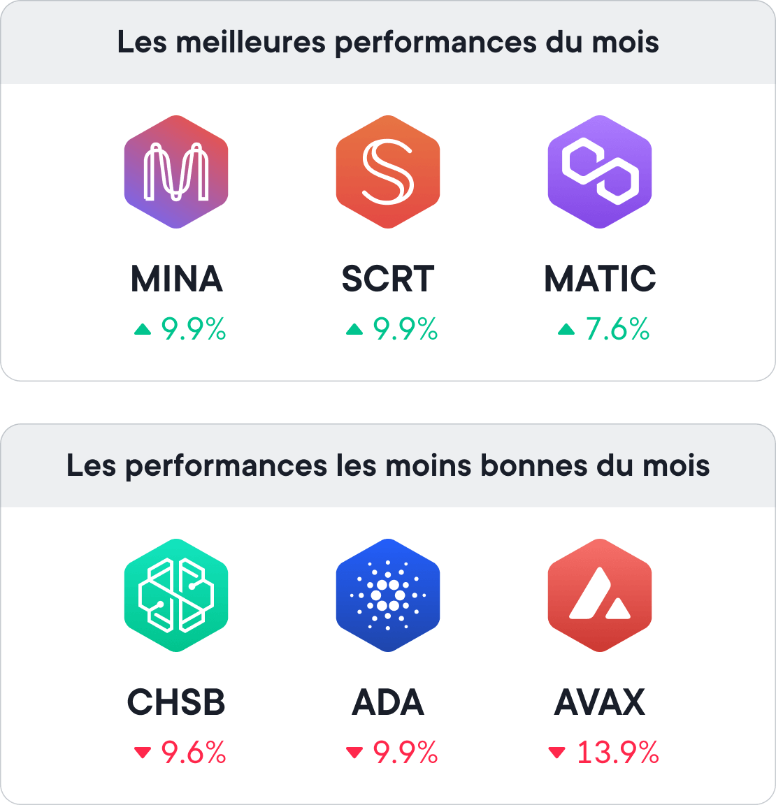 Alors qu'une volatilité de 10% en un mois est importante dans la finance traditionnelle, elle est considérée comme un mois plutôt calme dans le secteur des cryptomonnaies. En février, les gains ont été répartis assez équitablement entre les côtés positifs et négatifs. L'effet net de tout cela est que la performance de la Thématique Web3 en février était proche de 0, protégeant les utilisateurs des pertes de certains actifs au prix de la perte du potentiel de hausse des actifs les plus performants.