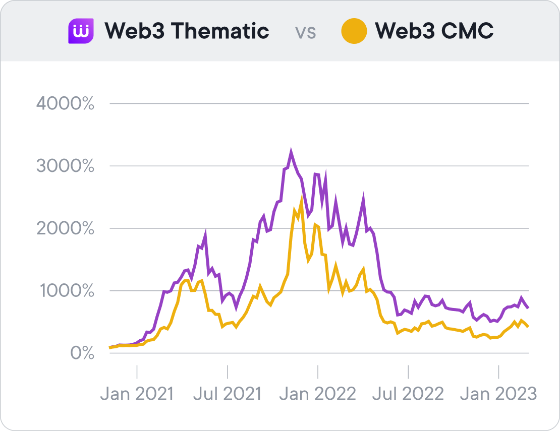 La Thématique Web3 est positionnée quelque part au milieu, ce qui est exactement son objectif, c'est-à-dire de surperformer les actifs les plus sûrs, tout en atténuant les inconvénients des actifs risqués.