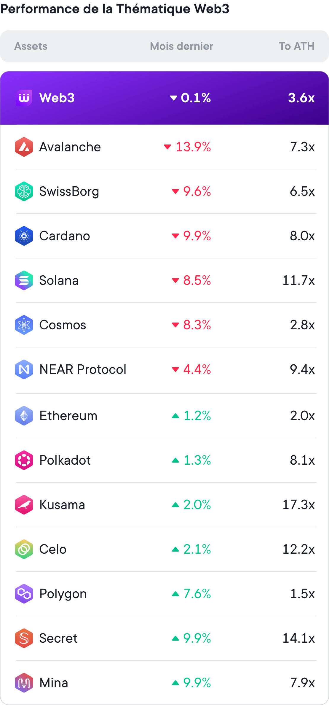 Jetons un coup d'œil à la performance de la Thématiques Web3, comparée à celle des tokens individuels qui la composent. La colonne du mois dernier représente la performance en janvier et la colonne "To ATH" représente les gains réalisés si les actifs revenaient à leur prix le plus élevé de tous les temps (ATH).