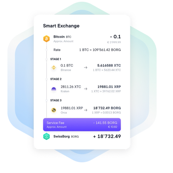 Le Smart Engine de SwissBorg se connecte aux principaux échanges centralisés et décentralisés, notamment Binance, Kraken et Orca, ainsi que directement sur la chaîne avec des réseaux comme Solana et Avalanche, pour acheter, vendre et échanger des crypto-monnaies au meilleur prix disponible.
